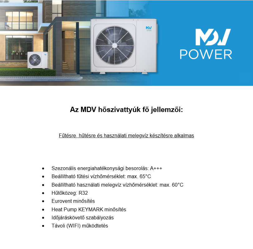 Ön éppen véleményezi: MDV MDVC-V12WD2BR8-P MDV Power monoblokkos hőszivattyú (R32, 12 kW, 3 fázis)